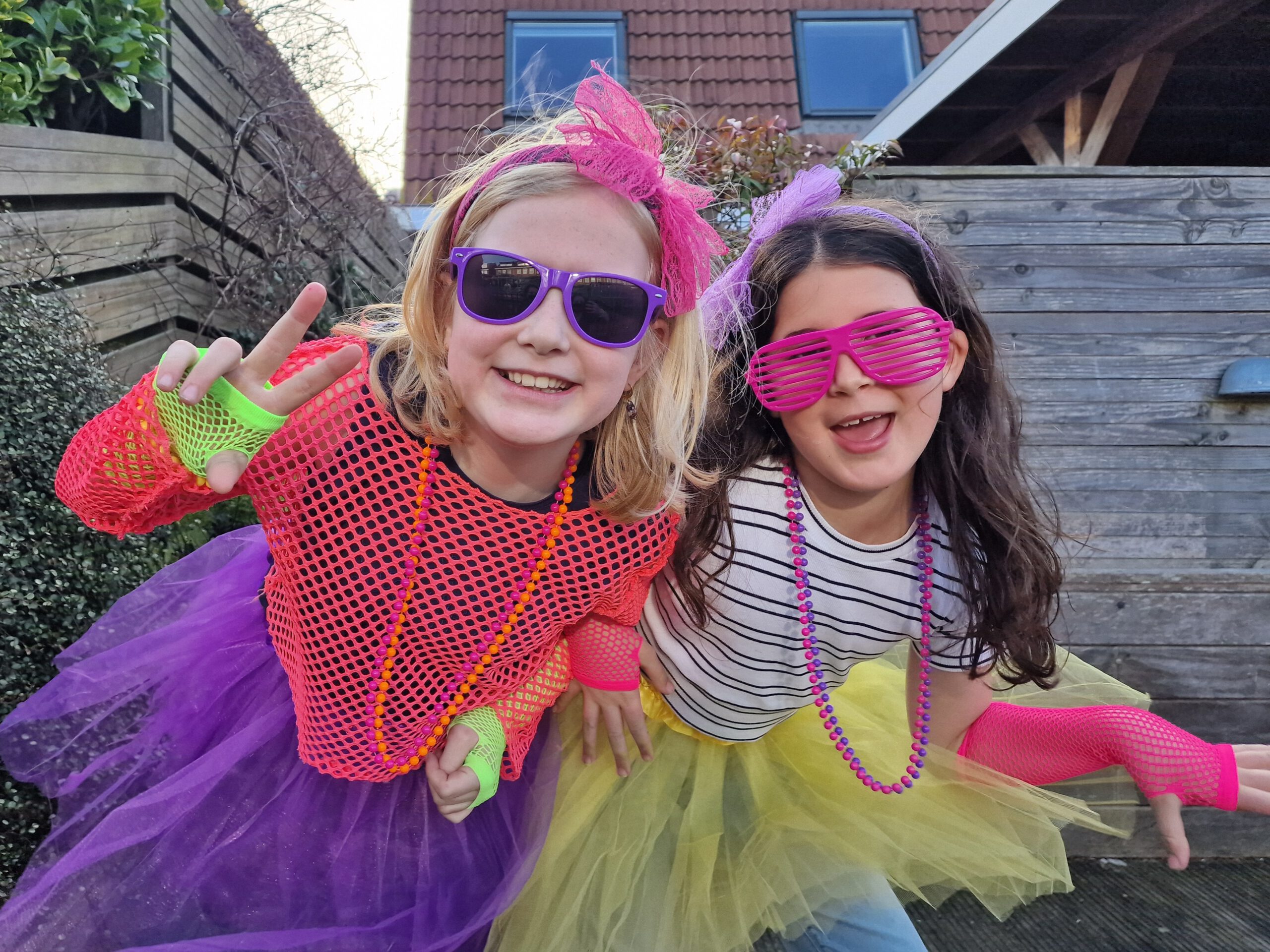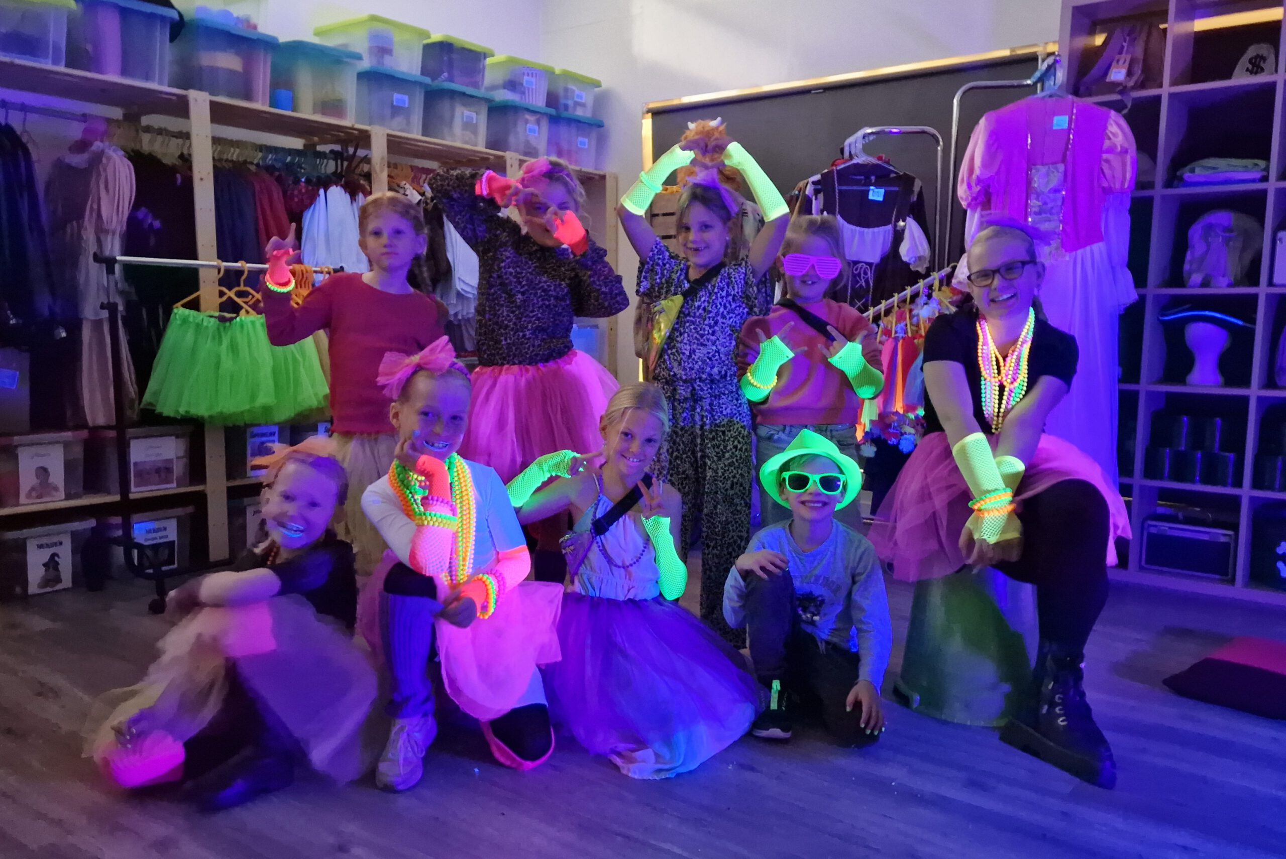 Onze Glow in the Darkkist is gevuld met heel veel leuke neonkleuren verkleedkleding zoals rokjes, bretels, hoedjes, diadeems, kettingen, armbanden, nethandschoenen en beenwarmers. Daarnaast ontvang je 1 grote uv-lamp voor op tafel, 3 uv-lampen voor in een fitting van jouw bestaande lampen thuis, allerlei leuke versiering en accessoires. Er zitten verschillende bakjes met nagellak, lippenstift, schmink en glo sticks in de kist en een plastic tafelkleed met servies (borden, bekers en bestek). Natuurlijk mogen kwalitatieve spelmaterialen om dit feest compleet te maken niet ontbreken.